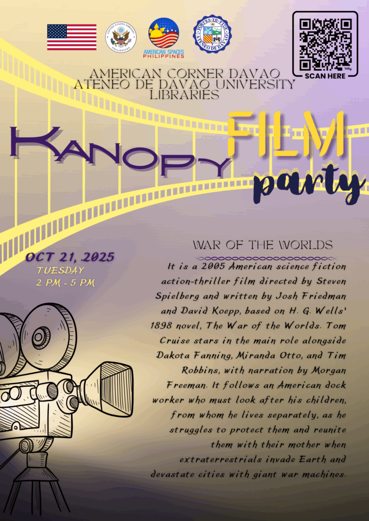 The most-awaited monthly event of the American Corner Davao, Kanopy Film Party, is making its return! The Kanopy Film Party for the month of October will be held on October 21, 2025, at the American Corner venue at Ateneo de Davao University, Jacinto Campus!